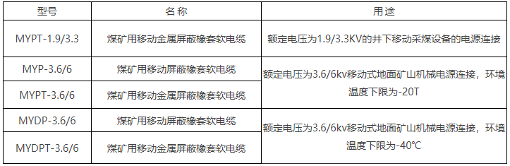 本產(chǎn)品為煤礦用橡套軟電纜系列產(chǎn)品,適用于額定電壓Uo/U為3.6/6KV及以下井下移動設(shè)備以及Uo/U 3.6/6KV移動式地面礦山機(jī)械電源連接。