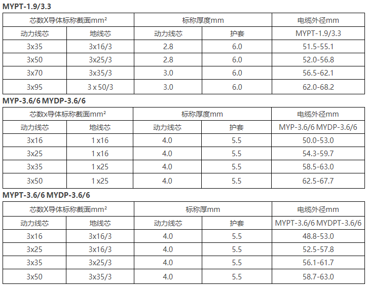 額定電壓3.6/6kV及以下煤礦用屏蔽軟電纜(MT818.7-2009 ) 一、用途 本產(chǎn)品為煤礦用橡套軟電纜系列產(chǎn)品,適用于額定電壓Uo/U為3.6/6KV及以下井下移動設(shè)備以及Uo/U 3.6/6KV移動式地面礦山機(jī)械電源連接。二、使用條件 線芯長期允許工作溫度為90℃,電纜的最小彎曲半徑為電纜直徑的6倍。電纜型號、名稱、用途 四、結(jié)構(gòu)規(guī)格尺寸 五、技術(shù)要求 電纜的絕緣電阻符合下表規(guī)定